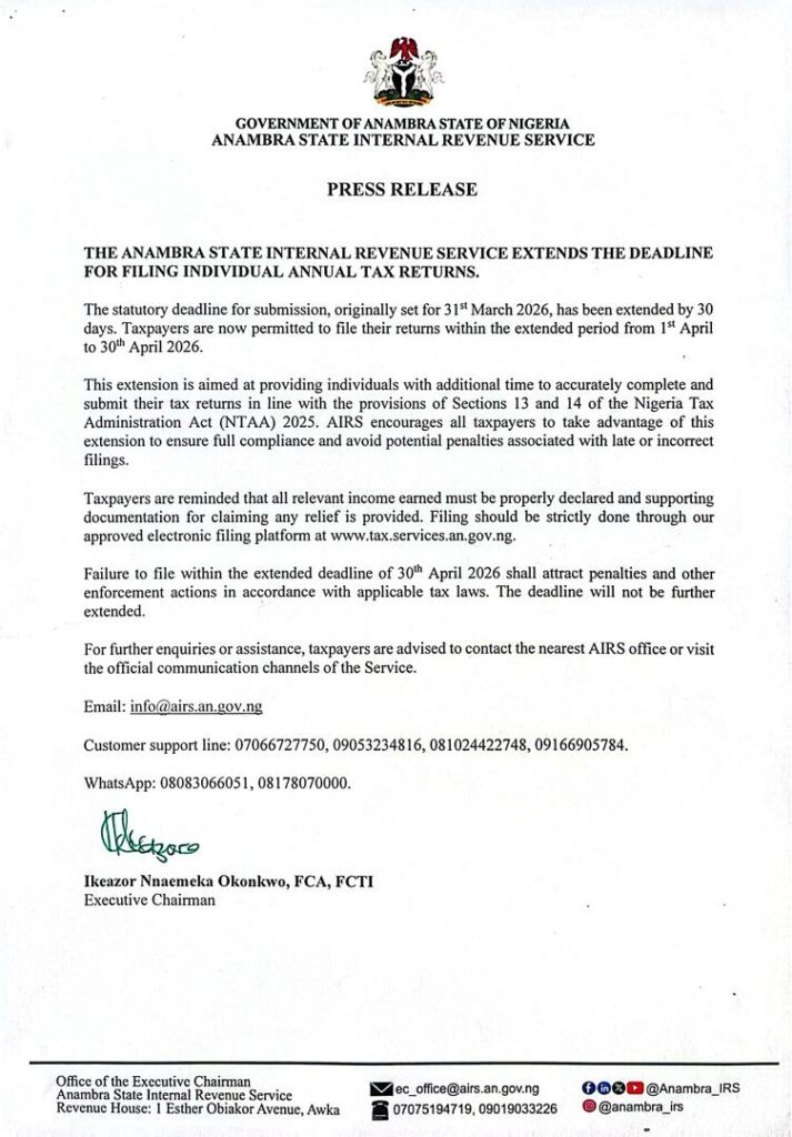 This is a friendly reminder from the Anambra State Internal Revenue Service that the deadline for filing your Annual Income